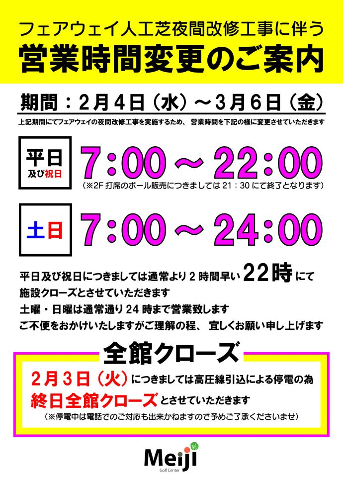 フェアウェイ夜間工事に伴う営業時間変更のご案内