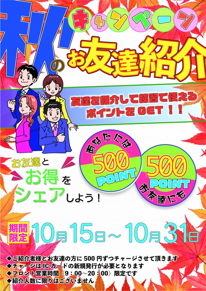 10月15日~10月31日まで、ICカードをまだお持ちでないお客様(お友達)をご紹介いただくと、ご紹介者様&お友達に練習場で使えるポイントを500円分ずつプレゼント!!