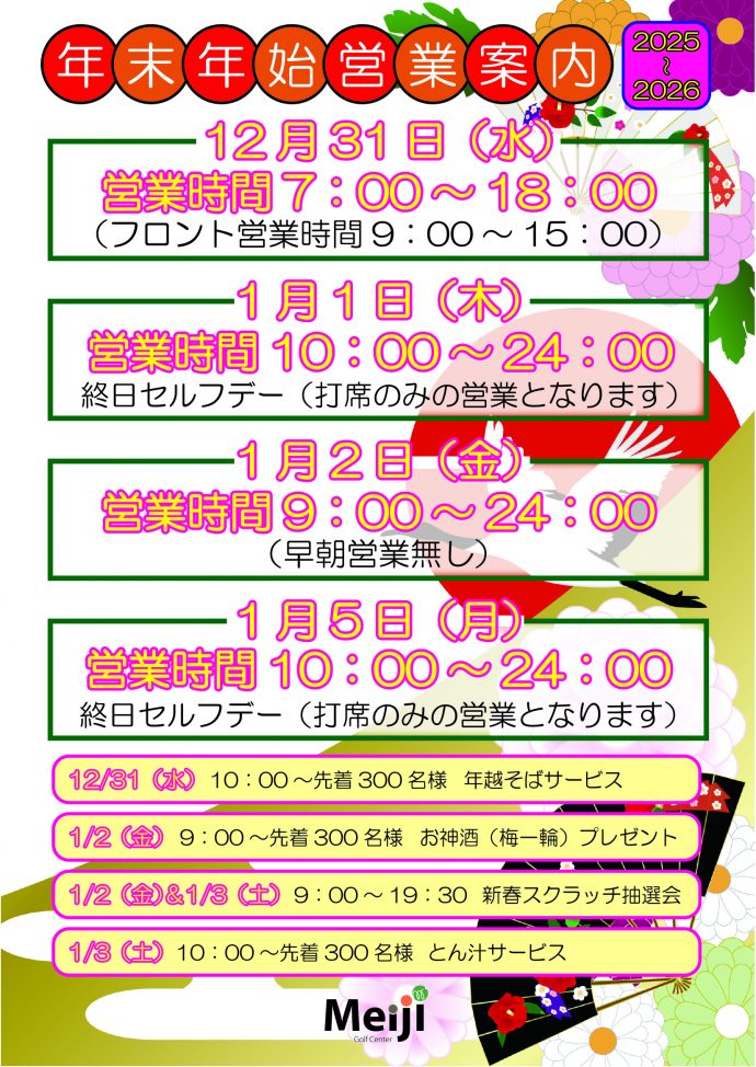 ■年始1月1日(木)はセルフデー(打席のみ営業10:00~24:00)